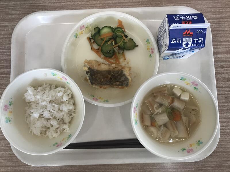 牛乳 むぎご飯 麩のみそ汁 魚のニンニクソースかけ 即席漬け
