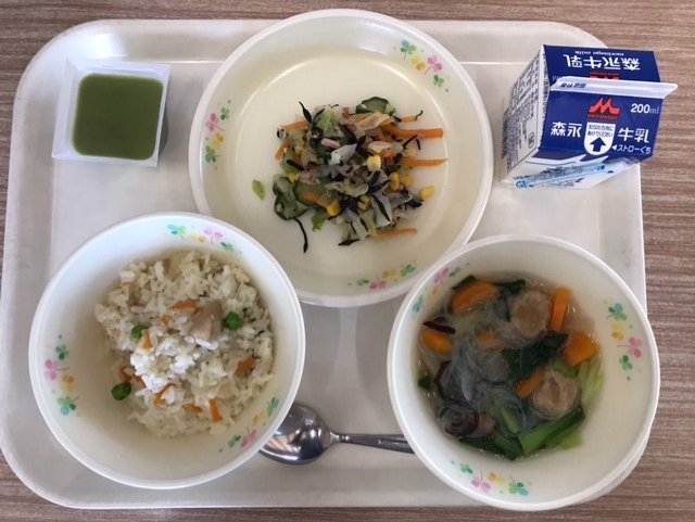 牛乳 チャーハン 肉団子スープ ひじきサラダ 抹茶ミルクゼリー