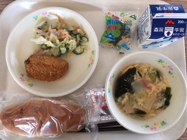 牛乳 コッペパン 卵スープ かつおフライ ごまマヨサラダ 柏もち