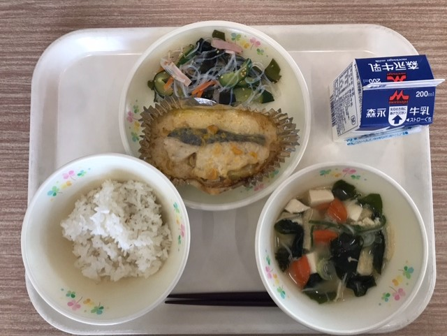 牛乳 むぎご飯 えのきとわかめのみそ汁 魚の黄金焼き 春雨の酢の物