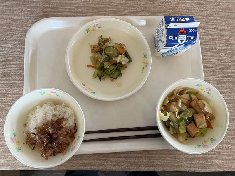 牛乳 むぎご飯 厚揚げとキャベツの味噌炒め