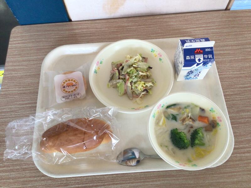 今日は、じゃがいものスープ煮です。給食で野菜は一年中使いますが、実は、時期によって産地が違います。今日のスープ煮の主役のじゃがいもなら、春は鹿児島や長崎、やがて熊本県の地元産で、あとはずっと北海道産です。玉ねぎも同じです。年中食べられるのは、南北に長い日本ならではの産地リレーのおかげなのです。スープ煮であたたまってください。
