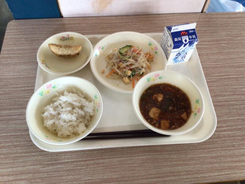 今日は、中華です。マーボー豆腐は、およそ100年前に「チャオチャオ」という女性の方が生み出した料理だそうです。今日は、葱の白い部分とごま油と豆板醤をフライパンに入れ、じわじわと炒めて葱油を作り、最後の仕上げで入れています。コクが出ていますか?ご飯にかけて食べてもおいしいですよ。しっかり噛んで食べてください。