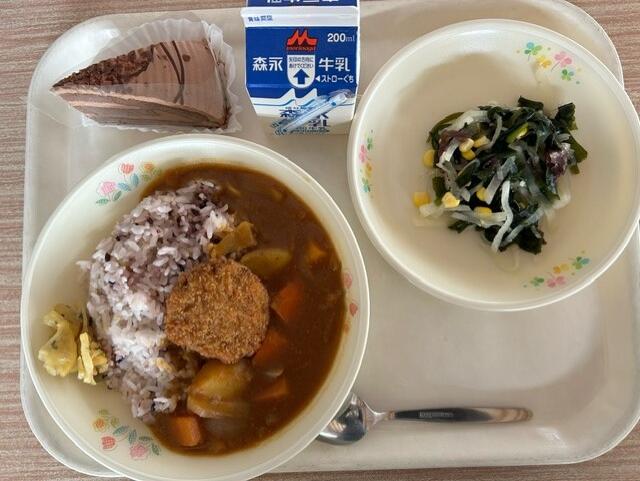牛乳 古代ご飯 カツカレー 海藻サラダ 福神づけ お祝いデザート