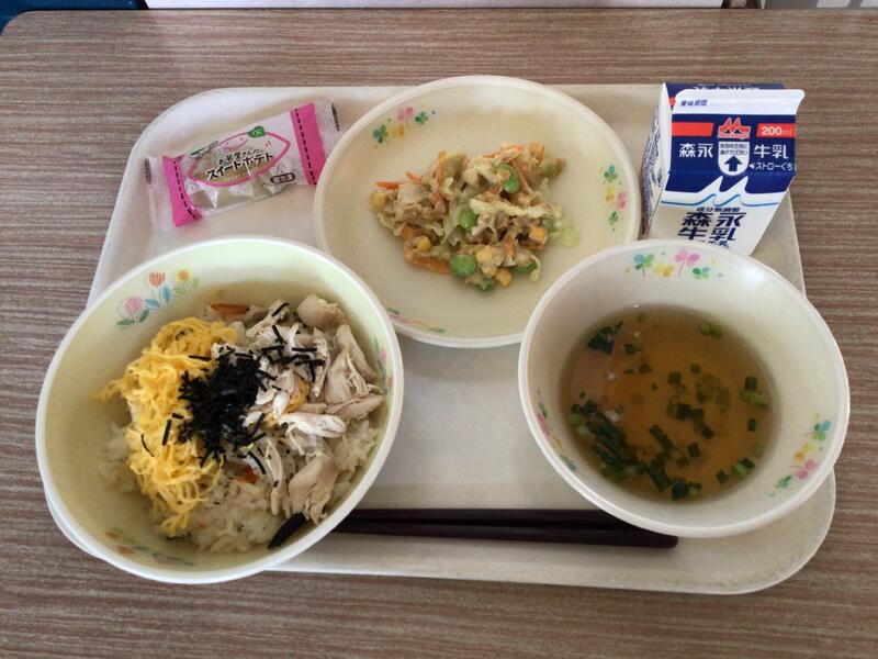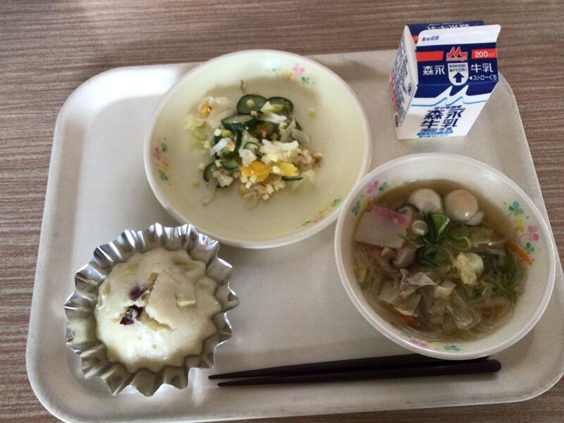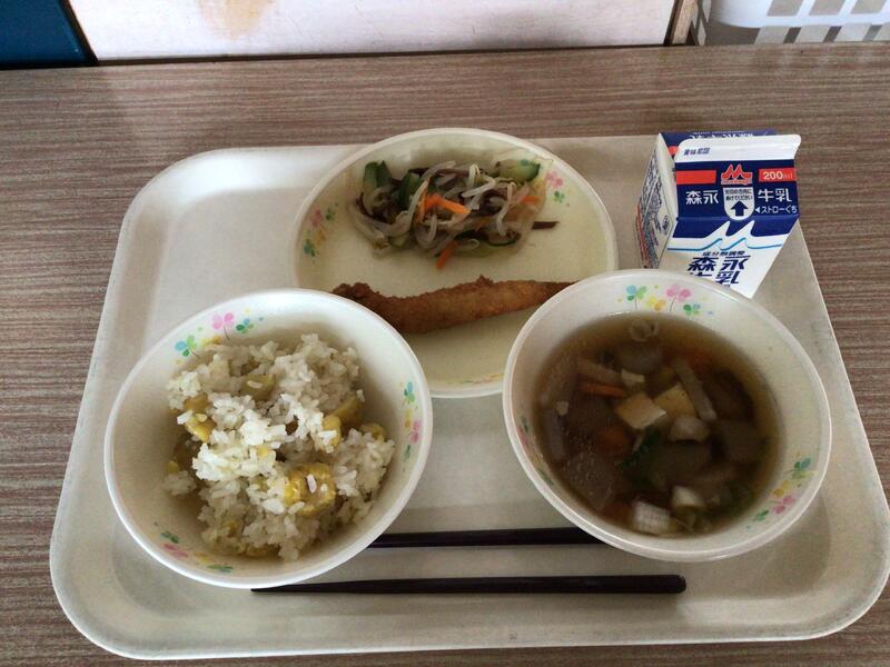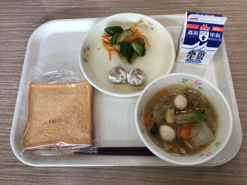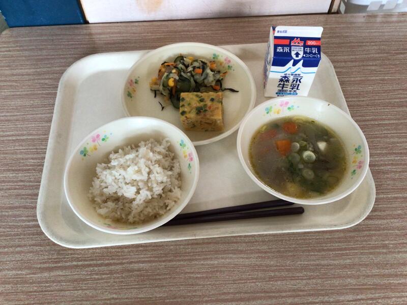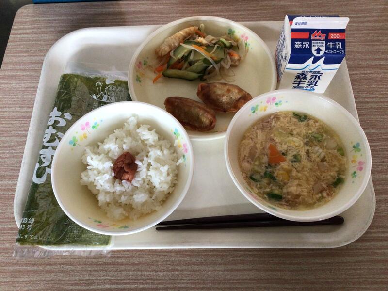 セルフおにぎりは、のりのまんなかにご飯や梅干しをのせて包んで食べます。みんなが安心して食べられるように、梅干しの種は抜いてありました。給食の先生方、さぞ大変だったことでしょう。ありがとうございます。ユイニータンは、は「玉、米、湯」と書きますが、ユイがトウモロコシ、タンがスープの意味です。かき卵が入った、中国のコーンスープです。地域によっては、スーミータンとも呼ばれています。