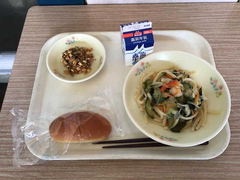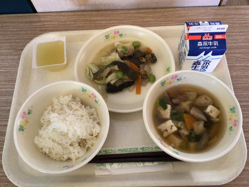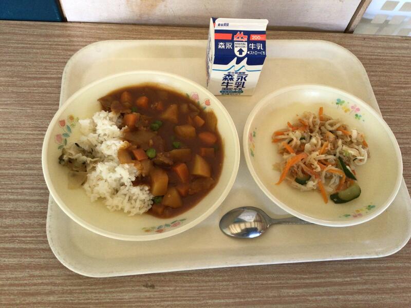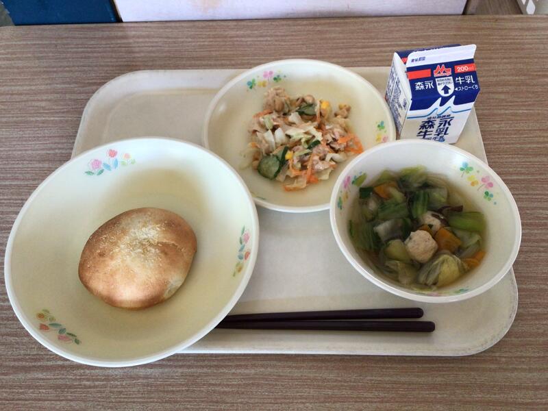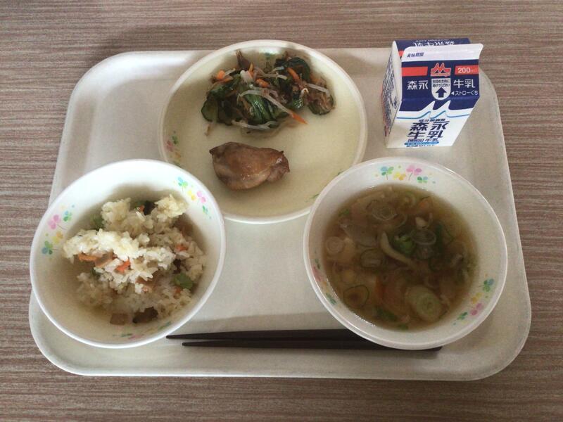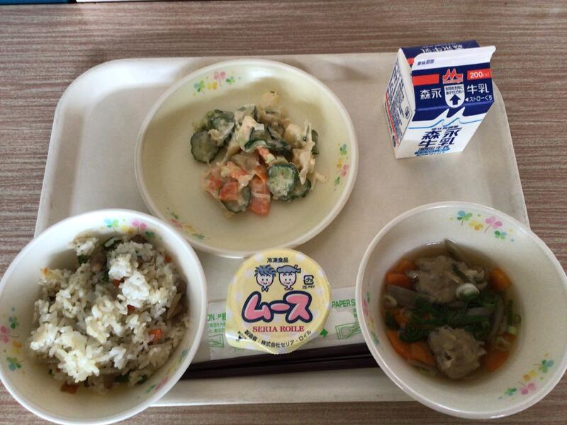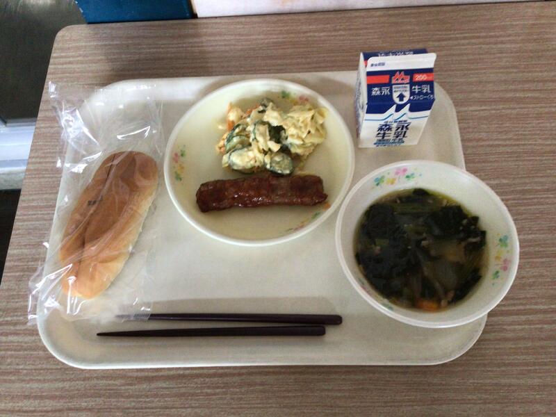 セルフおにぎりは、のりのまんなかにご飯や梅干しをのせて包んで食べます。みんなが安心して食べられるように、梅干しの種は抜いてありました。給食の先生方、さぞ大変だったことでしょう。ありがとうございます。ユイニータンは、は「玉、米、湯」と書きますが、ユイがトウモロコシ、タンがスープの意味です。かき卵が入った、中国のコーンスープです。地域によっては、スーミータンとも呼ばれています。