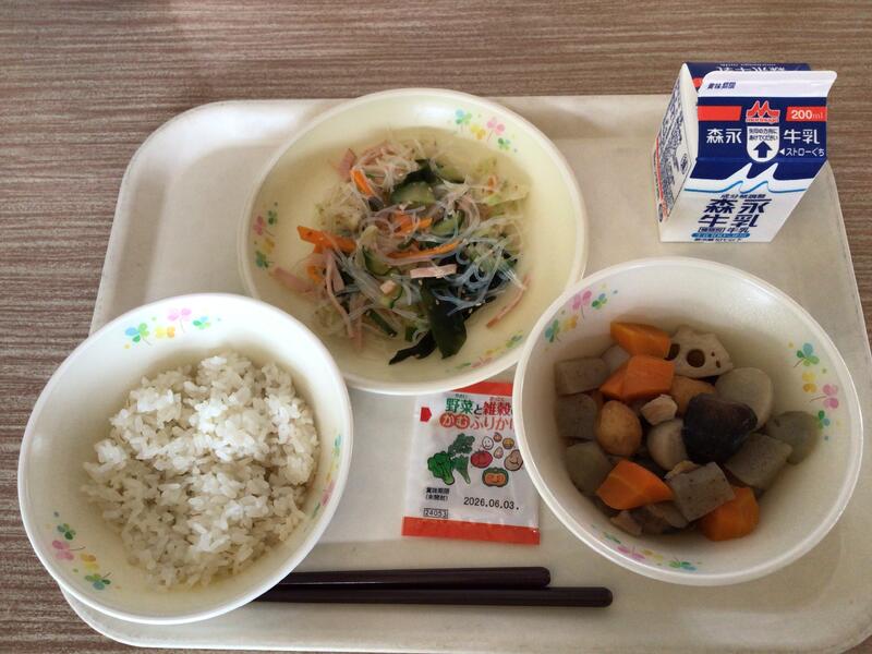 牛乳、麦ご飯、筑前煮、春雨の酢の物、ふりかけ