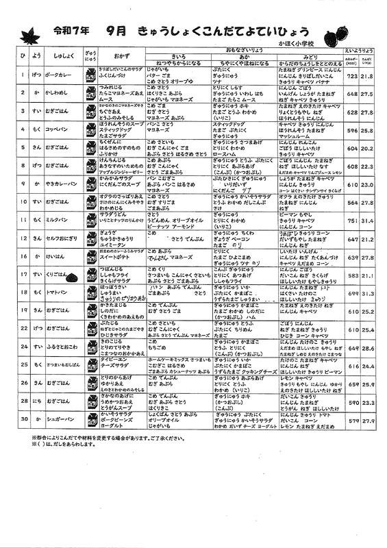 9月の献立表を掲載します。献立表を見ると、さまざまな献立があり工夫してあるんだなあと伝わってきます。子どもたちも、「今日は〇〇がおいしかった」「校長先生は、どれがおいしかったですか?」と給食についての話題で毎日盛り上がります。子どもたちがおいしく、そして栄養がとれるようにと工夫された献立と、それを少しでもおいしく食べてほしいと愛情込めて作ってくれる給食室の先生方のおかげで、毎日おいしい給食があります。感謝の気持ちを持って、いただきましょう。