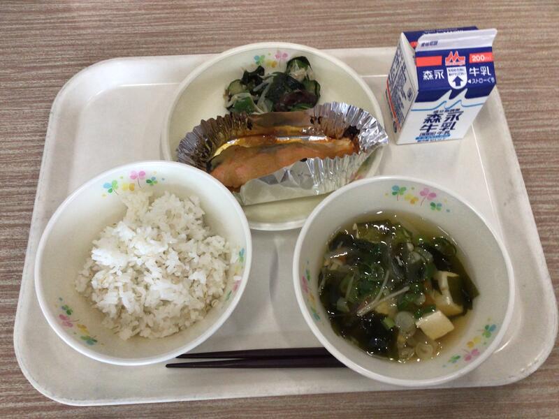 牛乳、麦ご飯、豚汁、ネギとじゃこの卵焼き、ひじきサラダ
