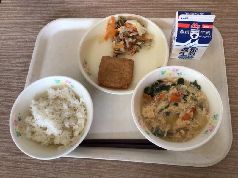 牛乳、麦ご飯、かき玉汁、茎わかめの和え物、信田に