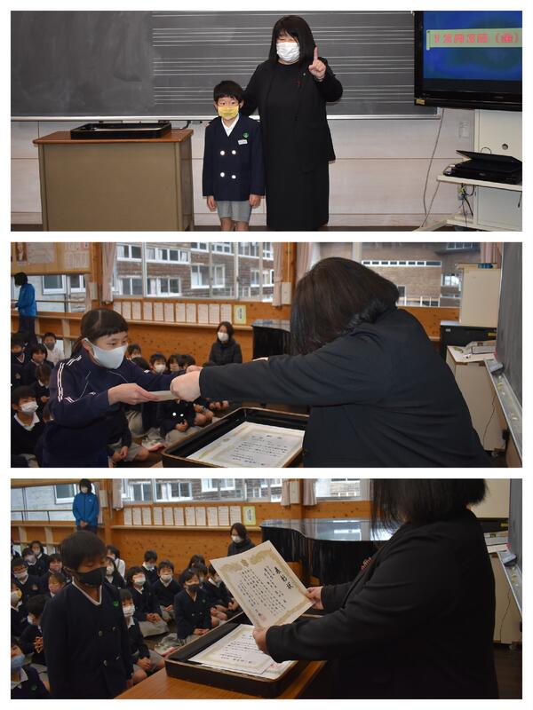 つぎは、表彰式。今年度も科学展をはじめ、県のコンクールに入賞する作品を、数多く出品することができました。鶴田校長から、それぞれの代表に表彰状が手渡されましたが、どの代表も大変引き締まった素敵な態度でした。