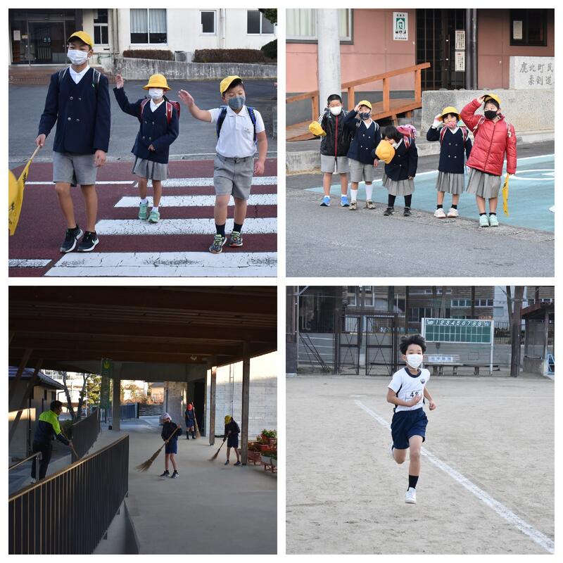 登校指導を終えて校舎に戻ろうとすると掃き掃除を頑張る6年生の姿がありました。運動場では、持久走大会に向けて自主練に励む子どもたちもいます。