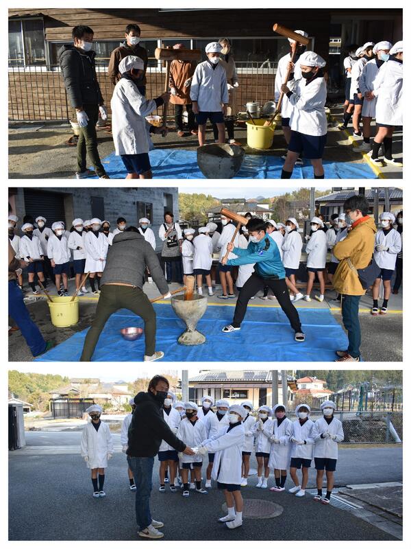 5年生は、広見農業同志会の皆さんの支援を受け、田植え、稲刈りを行い、当日の餅つきに至りました。昨年、実施できなかった6年生も急遽加わり大盛り上がりとなりました。