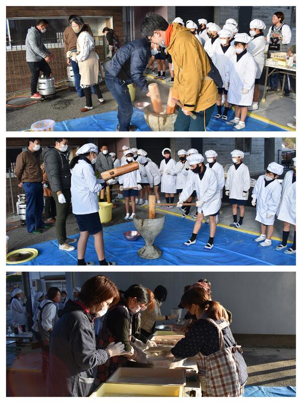 まず1つ目は、餅つき大会。5年生の学年委員さんには、前日から準備をお願いしました。当日も5年生の保護者の皆さんとPTA役員の皆さんには7時30分に集合していただき、餅つきの準備をしていただきました。