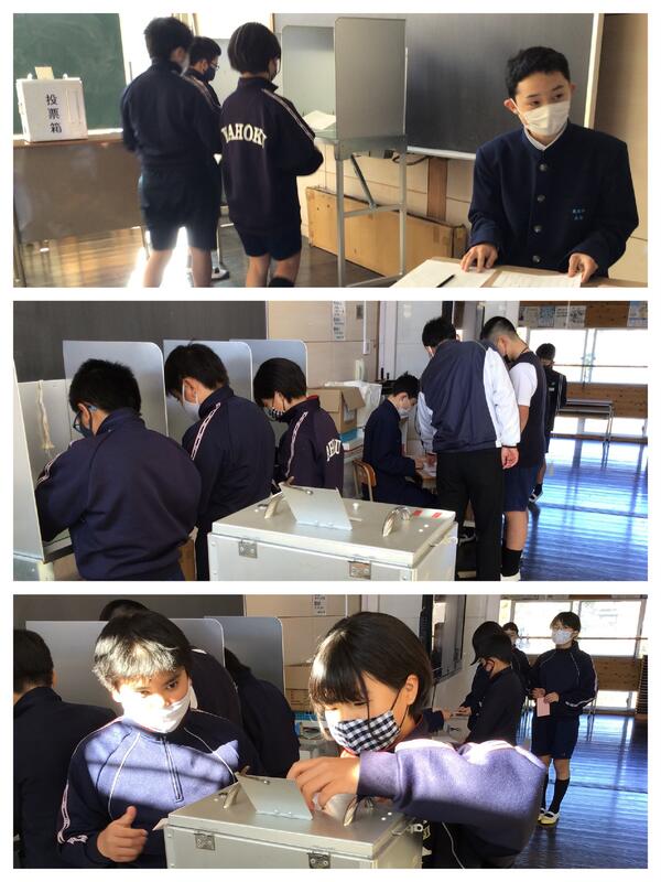 登校時の選挙運動に始まり、立会演説会、そして少人数教室に設置された選挙会場で、選挙管理委員立ち合いによる投票と子どもたちの自治意識を高めるには大変良い機会となったようです。
