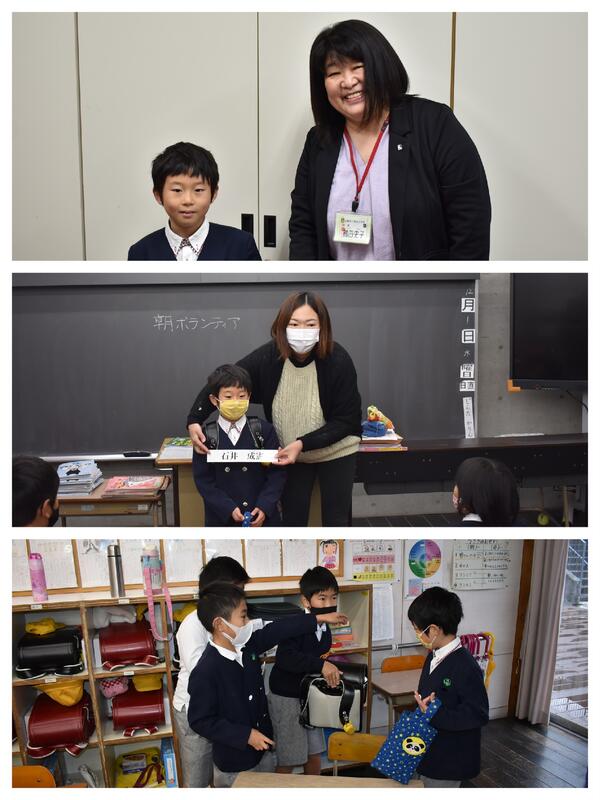 前もって知らされていた2年生は、朝からそわそわドキドキ。教室にやってくるのを待ちわびていたようです。自己紹介が終わると、さっそく周囲の子どもたちがロッカーの場所や道具の片づけ方を教えてくれていました。