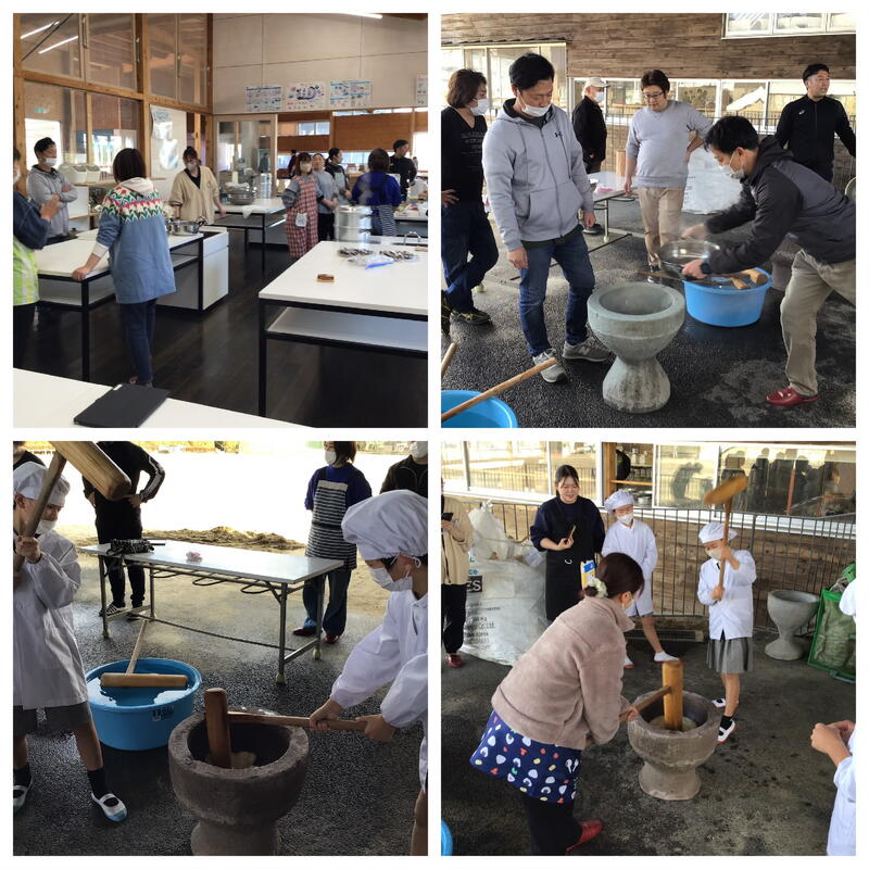 授業参観が中止となったため、日を改めて12月23日に5年生の「親子もちつき」を行いました。平日にもかかわらず、たくさんの保護者の皆様が参加してくださって、とってもおいしいおもちができました。何日も前から、餅つきに使う道具を洗って用意していた5年生。農業同志会の皆様にお世話になって、田植えと稲刈りをさせていただき、収穫した餅米でもちつきをしました。家庭科室で蒸して、ランチルームの外で餅つきと餅まるめをしました。つきたてのおいしいお餅、ごちそうさまでした!