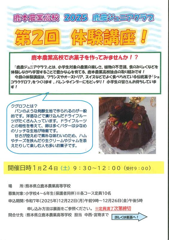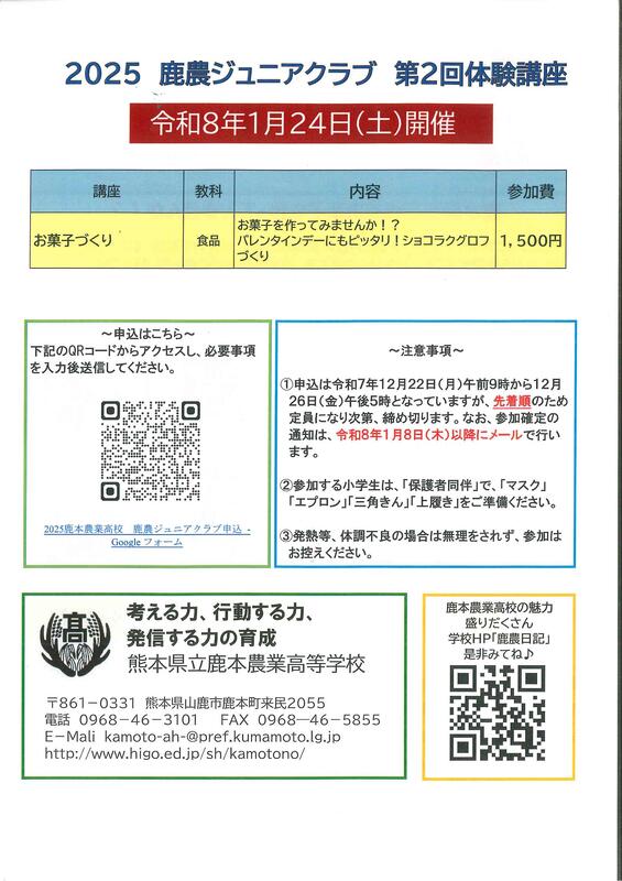 鹿本農業高等学校より鹿農ジュニアクラブ「第2回体験講座(4~6年対象)」の案内が届きました。