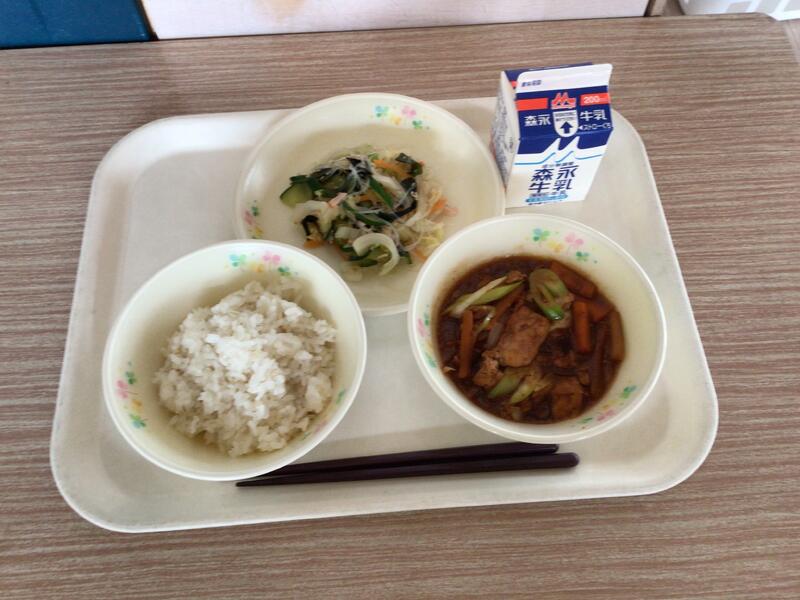 牛乳、麦ご飯、豆乳味噌汁、肉詰めいなりの甘辛煮、野菜の梅肉和え、ヨーグルト