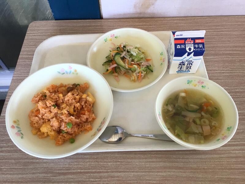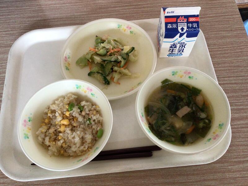 牛乳、ショウガチャーハン、あおさ汁、ちくわの磯辺揚げ、おかか和え