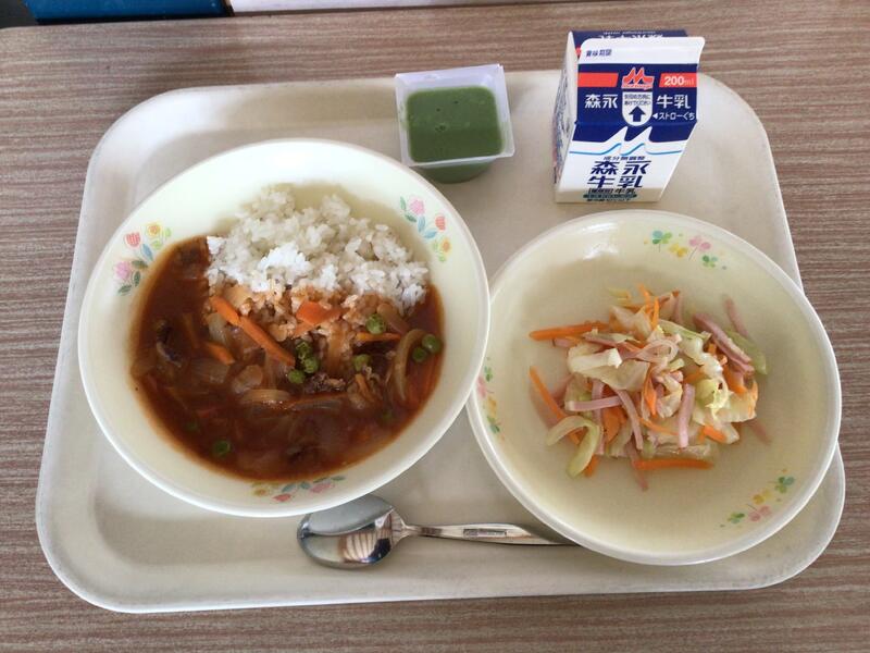 今日はスーミータンです。中国の家庭でよく食べられているとろっとしたスープです。中国語で、「スーミー」はとうもろこし、「タン」はスープを表しています。クリーム状のコーンと卵を使い、まろやかな甘さで、とろみのあるスープです。給食では、野菜やお肉なども加えて、栄養満点にしてあります。キムタクご飯もスーミータンも大人気です。