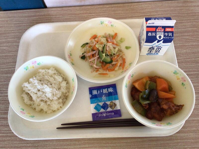 牛乳、麦ご飯、すまし汁、鶏肉のマーマレード焼き、ごぼうサラダ