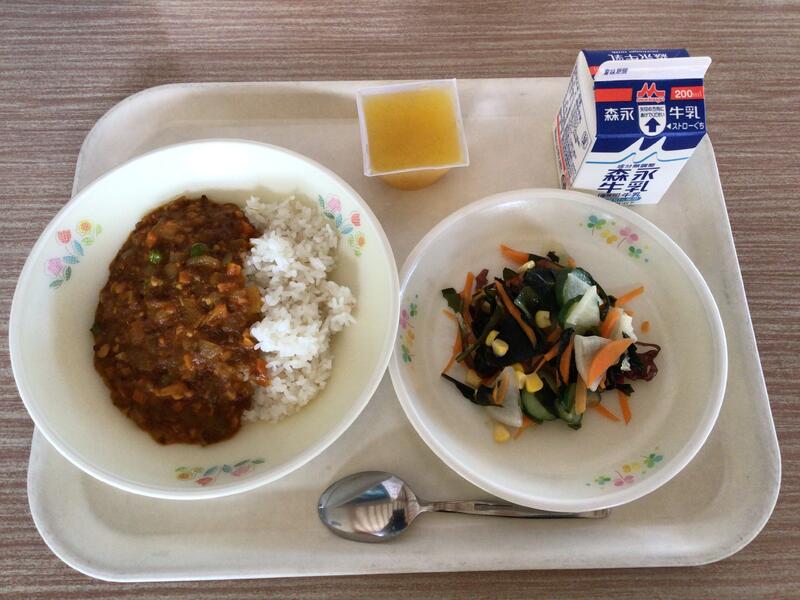 牛乳、冬野菜カレー、こんにゃくサラダ、はちみつレモンゼリー