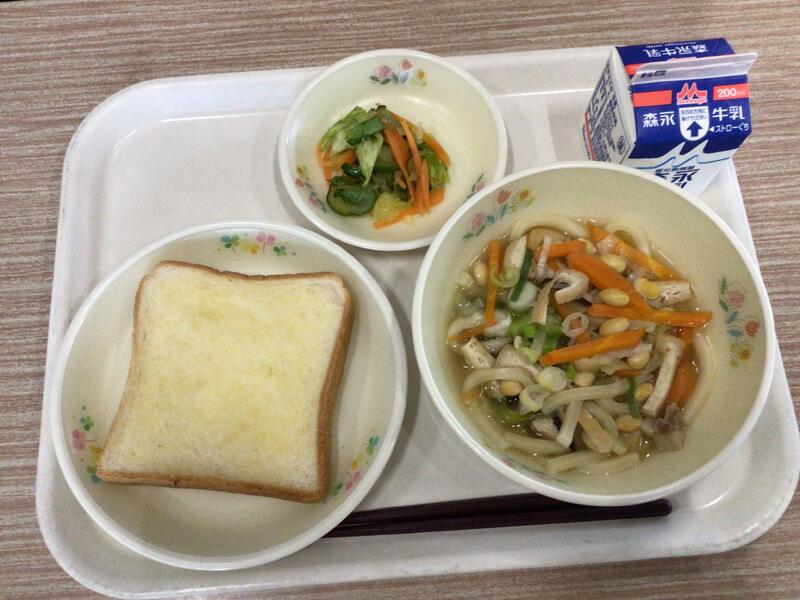 牛乳、食パン、かき揚げうどん、ツナサラダ、ブルーベリージャム