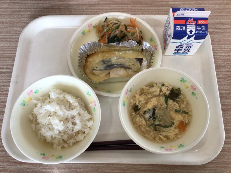 牛乳、麦ご飯、豆腐の味噌汁、ホキの銀河焼き、大根サラダ