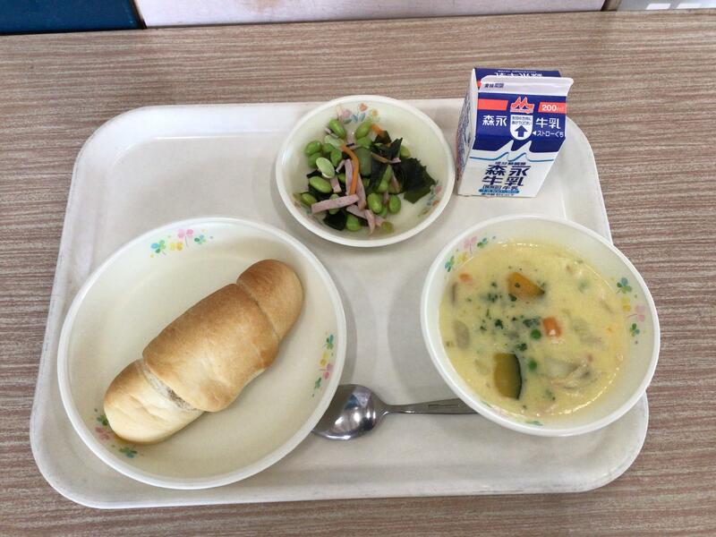 牛乳、ミルクパン、クリームシチュー、にんじんサラダ、ココアビーンズ