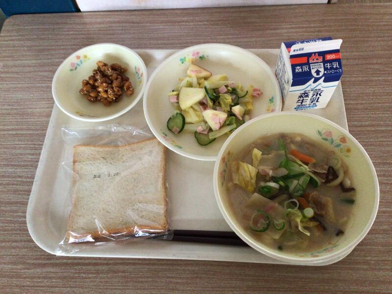 牛乳、食パン、さいめん、リンゴサラダ、まりちゃんまめ