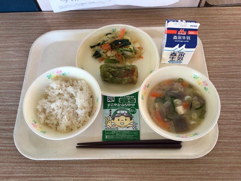 牛乳、麦ご飯、豚汁、ちくわのお茶揚げ、小松菜のアーモンド和え