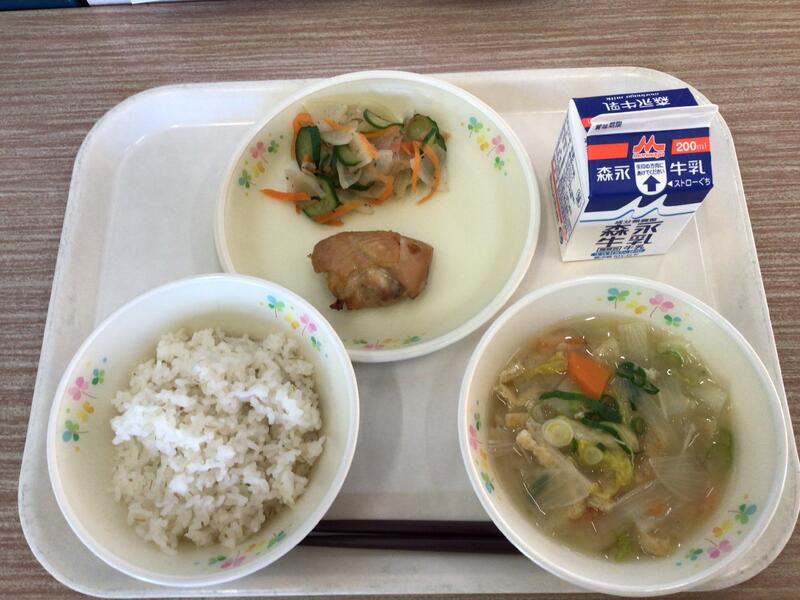 牛乳、麦ご飯、白菜の味噌汁、鶏肉の塩麹焼き、うめかつおあえ