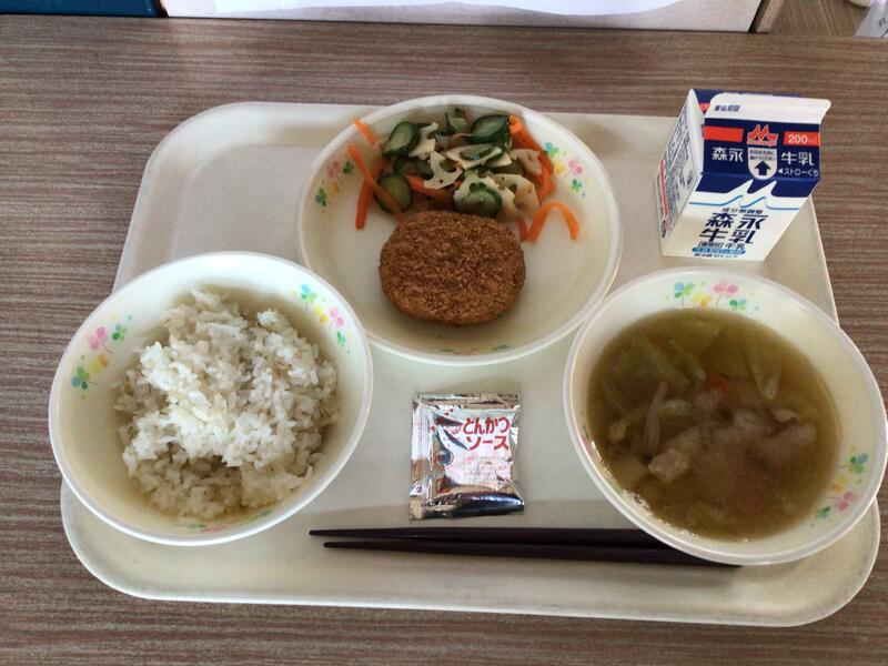 牛乳、麦ご飯、鶏肉のみぞれ汁、コロッケ、キュウリとレンコンの酢の物