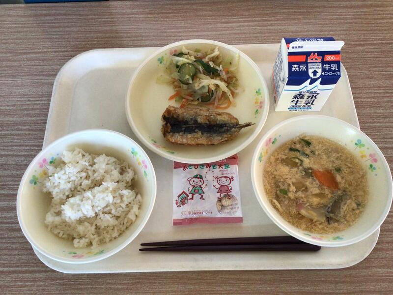 牛乳、麦ご飯、かき玉汁、鰯の揚げ煮、梅の和え物、味噌大豆