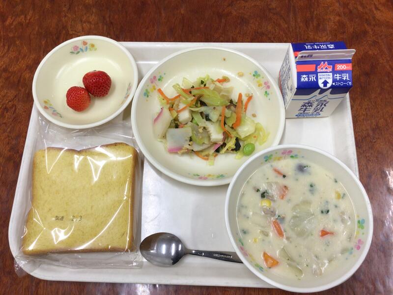 牛乳、南関あげ丼、いそあえ、いちご
