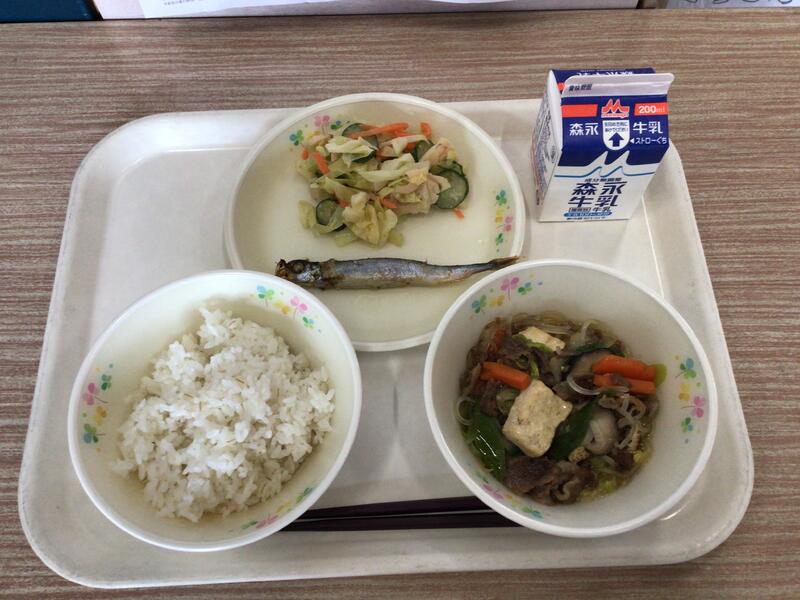 牛乳、麦ご飯、すき焼き、ししゃもの香焼き、野菜のごまだれ