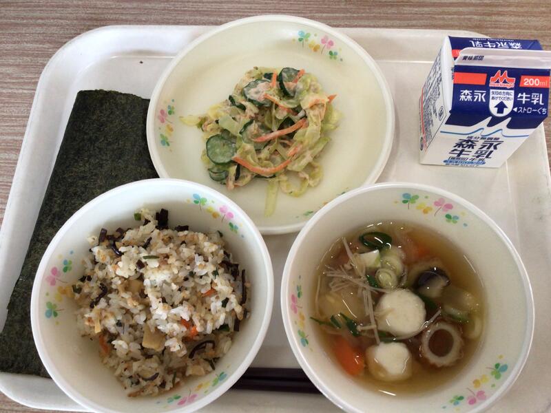 今日は、手巻きご飯です。海苔の上にご飯、和え物をのせて包んで食べてください。手で食べるときのメニューはしっかり手を洗うことが重要です。きれいな手で食べると給食はもっとおいしく安心して食べられます。元気に過ごすためにも手洗いうがいをして、しっかりと給食を食べましょう。