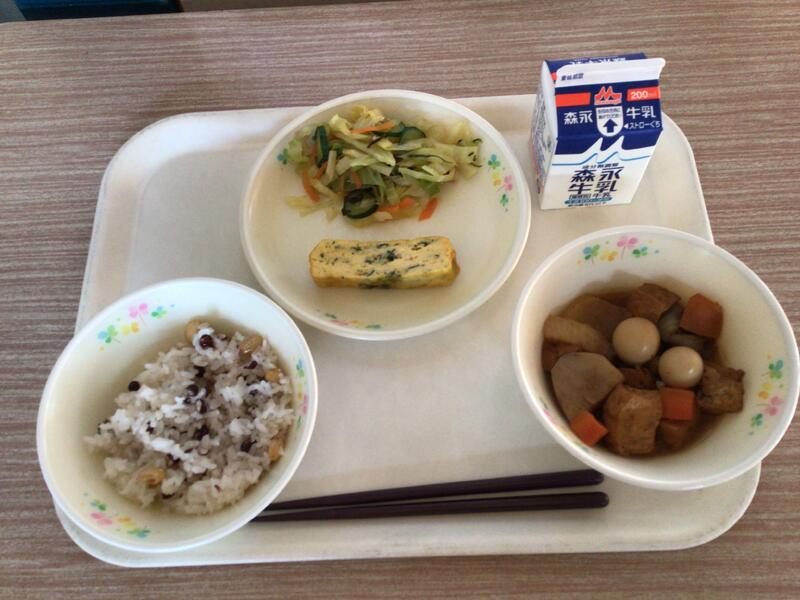今日は綱引きよいしょです。不動岩の民話から考えられた給食のメニューです。大豆と餅米、小豆を一緒に炊いたおこわです。豆は、噛めば噛むほど旨味が出ます。また、鉄火煮は、鉄火(てっか)のような赤色の味噌を使用することから鉄火煮という名前がつきました。しっかり食べて体調を崩さない体を作りましょう。