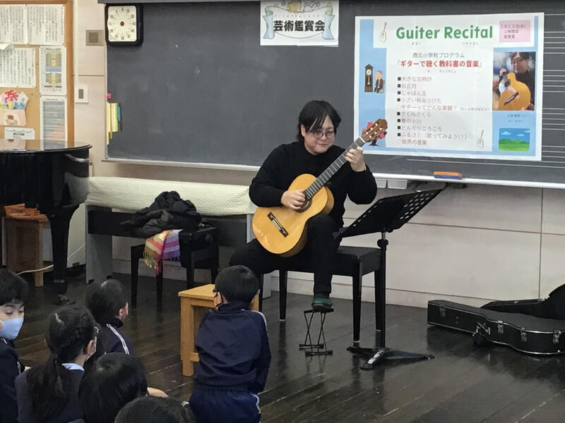 2月12日(木)芸術鑑賞会を行いました。演奏者は、三良裕亮さん。鹿北中学校の原口先生の教え子さんで、現在、平成音楽大学の講師、熊本県・福岡県でギター教室を開催されています。今回は「ギターで聴く教科書の音楽」として、みんながよく知っている曲をたくさん演奏していただきました。最後には、スペインの曲「アルハンブラの思い出」をトレモロという演奏技術を使って披露してくださいました。クラッシックギターの優しい音色は、とても心地よく、素敵な時間を過ごすことができました。