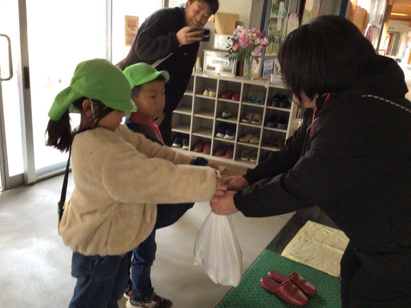 2月4日(水)5時間目が終わり、1~3年生が下校する頃、小学校の玄関に「こんにちは~」とかわいい声。出てみると、まほろば保育園の年長児さんたちです。代表の二人が差し出した手には、ビニール袋が下がっています。すると、「焼きいもをしたので、どうぞ食べてください」とまだあったかい焼きいもを届けてくれたのでした。先日の体験入学で少しは慣れたかな?知っている先生やお兄ちゃんお姉ちゃんの担任の先生を見かけると笑顔で話している姿もみられました。もうすぐ1年生ですね。おいしい差し入れをありがとうございました。