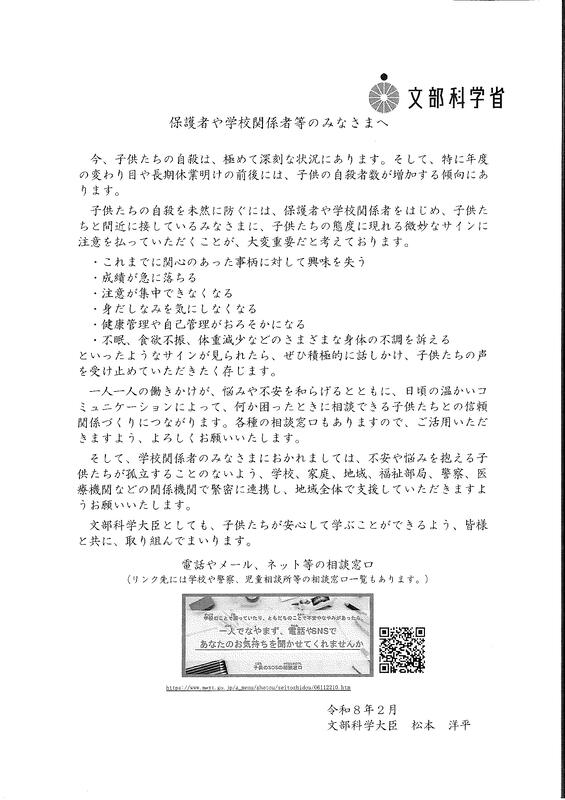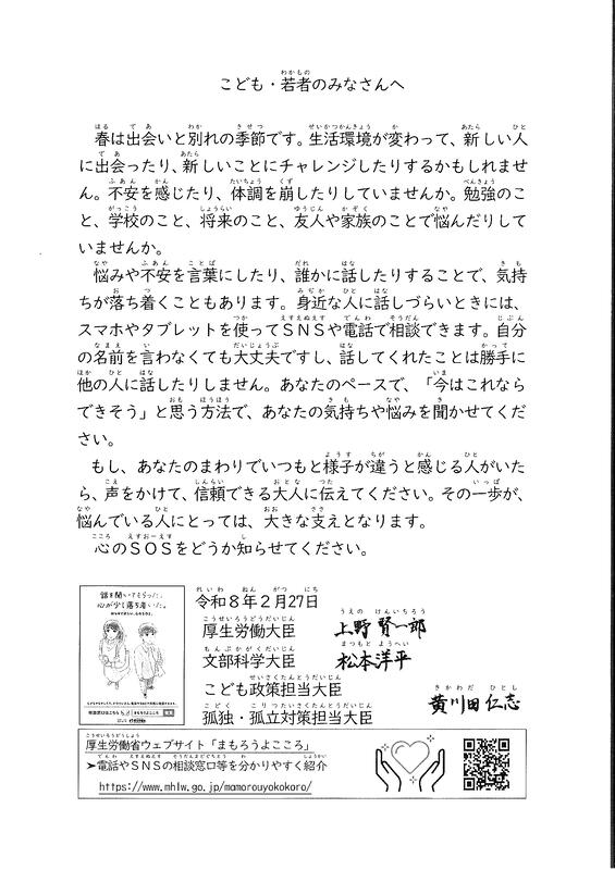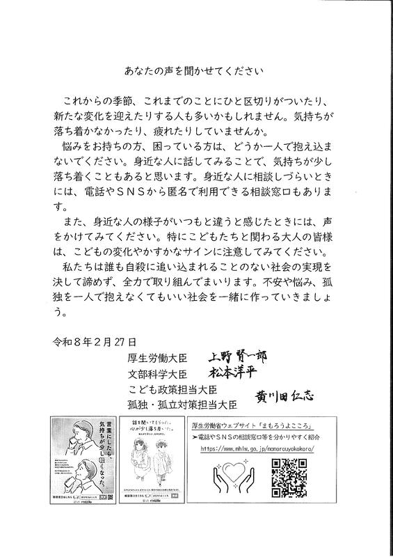 心が不安定になりやすいこの時期、春休み(長期休業)を前に文部科学大臣から子どもの自殺防止に向けたメッセージが届いています。