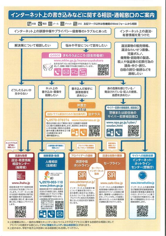 学校では、子どたちへのいじめ防止に関する指導と同時に相談窓口も下記のとおり紹介しております。