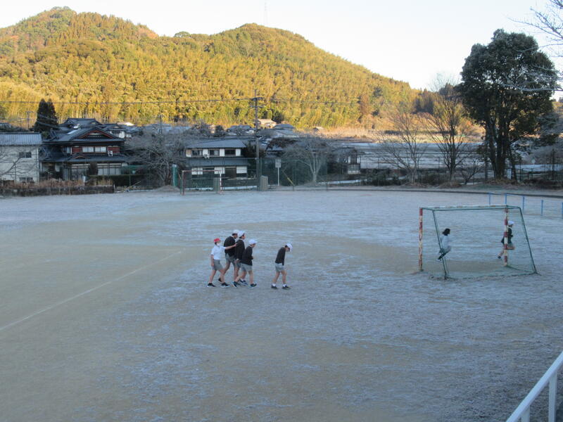 運動場は、霜で白くなりました。そんな中、子どもたちは、朝からみんなで「鬼ごっこ」を楽しんでいました。