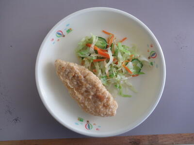 〇今日の給食は「ふるさとくまさんデー」とし、熊本県産の食材を使ったメニューが出されました。(「さつまじる」「しょうがあえ」「まだいのてんぷら」)まだいのてんぷらは、熊本県海水養殖漁業協同組合から提供していただいた「天草さくら鯛」が使われました。