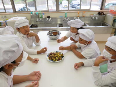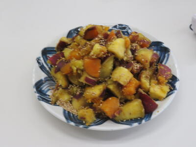 〇10月27日(木)、家庭科室で1・5・6年生が収穫したさつまいもで「大学いも」を作りました。給食前でしたが、みんなとてもおいしそうに食べていました。