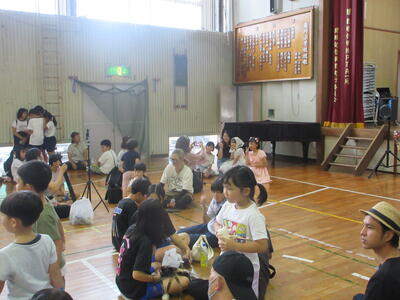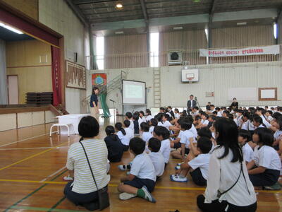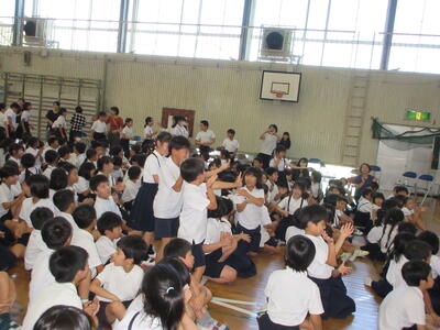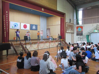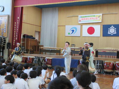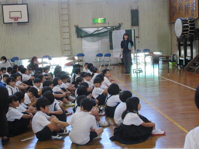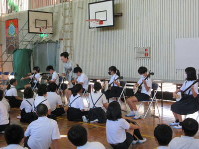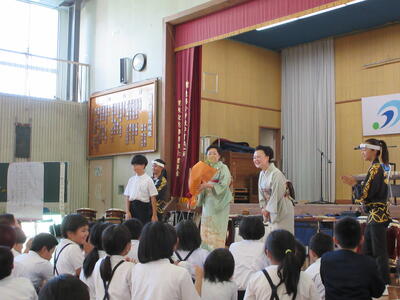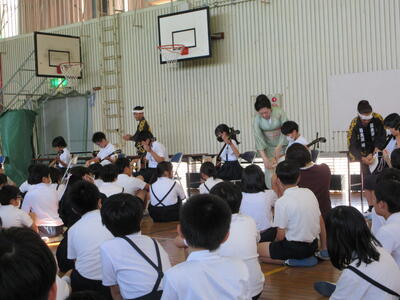 今日は「にぎわい座」の方々が亀川小学校においでいただき、演奏ならびに体験をおこなってくださいました。