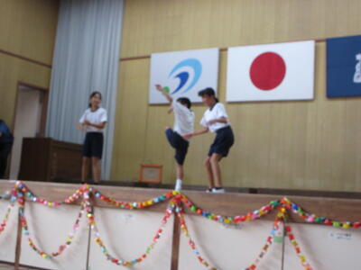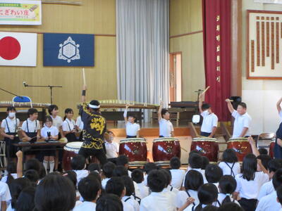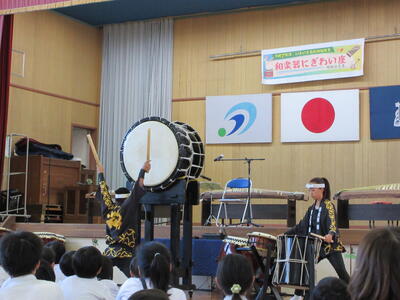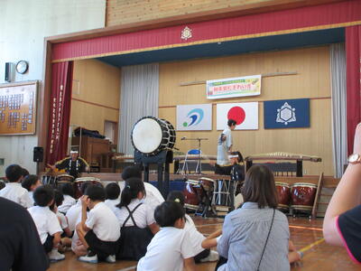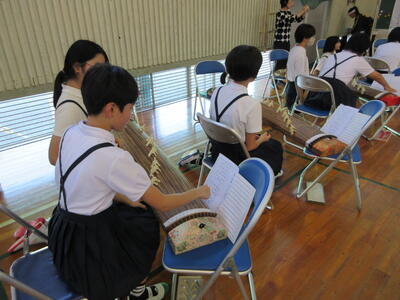 5校時は全学年で箏や和太鼓等の演奏の鑑賞を行いました。6校時は4年生以上のみで三味線、琴、和太鼓等の体験(演奏)を行いました。子どもたちの力はすごいです。琴の楽譜は漢数字でしたが演奏できていました。三味線も音が出ていました。すごいです。わたしも初めてみる楽器もあり、触れてみたかったです。わたしも弾いてみたかったです。子どもたちが羨ましかったです。また「にぎわい座」のみなさんに来ていただきたいです。文化の秋・・・満喫で