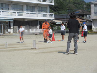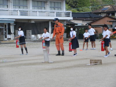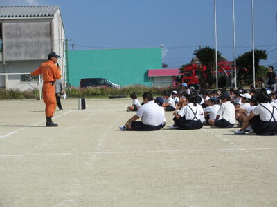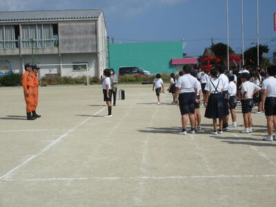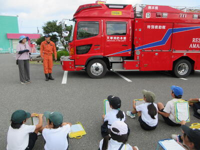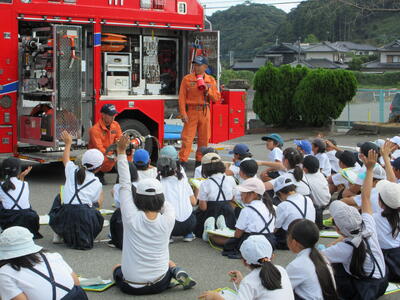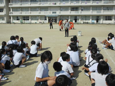 10月14日火曜日、天草広域連合中央消防署より2名の消防士さんに来校いただき、火災避難訓練時を実施しました。火災避難へのご指導、消火器の取り扱い方、また1、3年生には消防車についての説明を行っていただきました。火災を絶対に出さないために、また火災が起きてしまっても自分の命を守る行動を行うこと、これらを学ぶことができました。