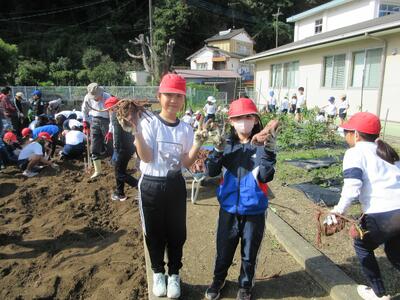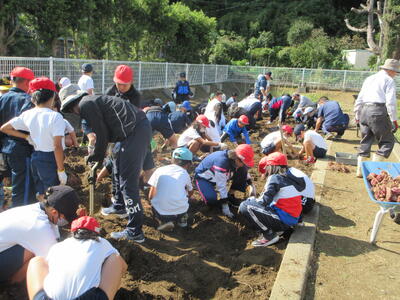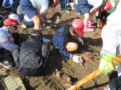 今日は5校時に4年生が春に植えたお芋の収穫がありました。4年生は昨日実施する予定でしたが、雨のために今日になりました。みんな準備万端!とっても楽しみにしていたのでみんながんばりました。大きな大きなお芋がたくさんとれました。今日は地域の方々が食改の方々をはじめ多くお手伝いに来校してくださいました。ありがとうございました。